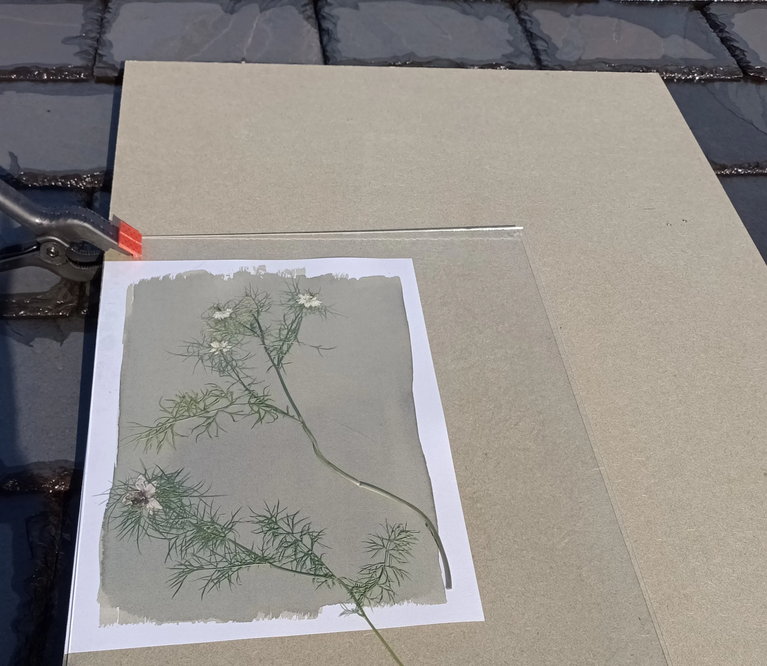 Once the paper has been left to dry overnight, I position the flowers onto the paper. The paper and flowers are then placed under glass and exposed to sunlight for approximately 10 minutes (longer on a cloudy day). The dried flowers in the image below are Nigella.