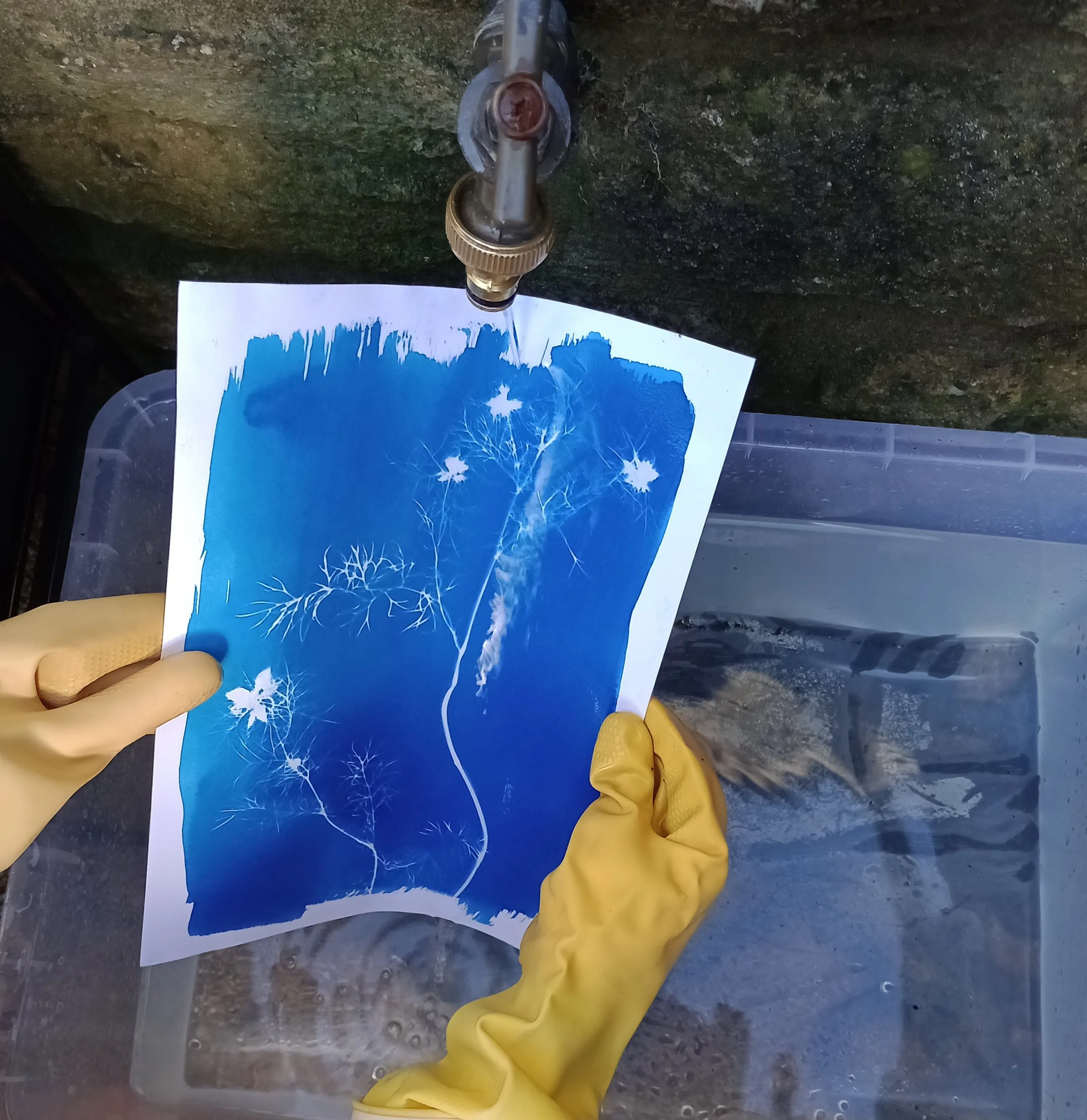 Once the paper has been exposed to the sun, I rinse the paper in water for around 10 minutes.